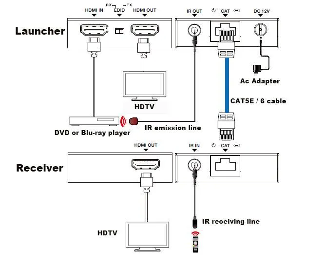| Receiver | input:1×IR IN [3.5mm,Stereo, Mini socket] 1×CAT IN [RJ45, 8-pin Receptacle] Output:1×HDMI OUT [Type A, 19-pin Receptacle] |