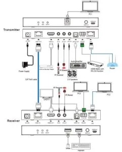 EXT-HB-100AU 18Gbps HDMI Extender can extend high definition video / audio signal, RS-232, bi-directional IR and internet signal, at the distance of up to 328ft /100 meters between transmitter and receiver via a single CAT6a/7 cable and support resolution up to 4K2K@60Hz 4:4:4. The Transmitter supports ARC function and local audio extract. In addition, the extender is equipped with bi-directional IR pass-through which allows for source and display control. It also supports USB KVM and PoC function.
