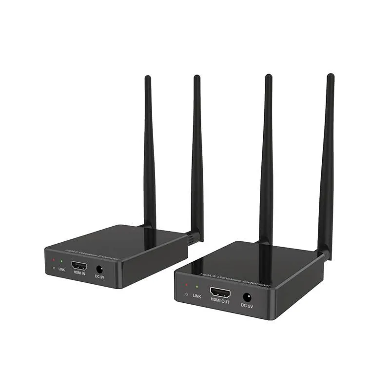 This product is based on the H.265 standard solution, which transmits a HD source signal to an HD display device. It wirelessly extends the distance between the encoder and decoder up to 100 meters (in an open environment without Wi-Fi interference). It supports one-way IR control and provides configurable high quality low bandwidth H.265Compressed video (resolution up to 1080P@60Hz) This wireless extender can easily realize the wireless transmission of HD audio and video signals in the same environment, thus eliminating the tedious work of burying wire in the early stage of wired transmission.