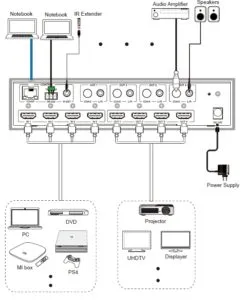 Output Ports 4×HDMI Type A [19-pin female] 4×L/R audio out [3.5mm Stereo Mini-jack] 4×COAX audio out [RCA]