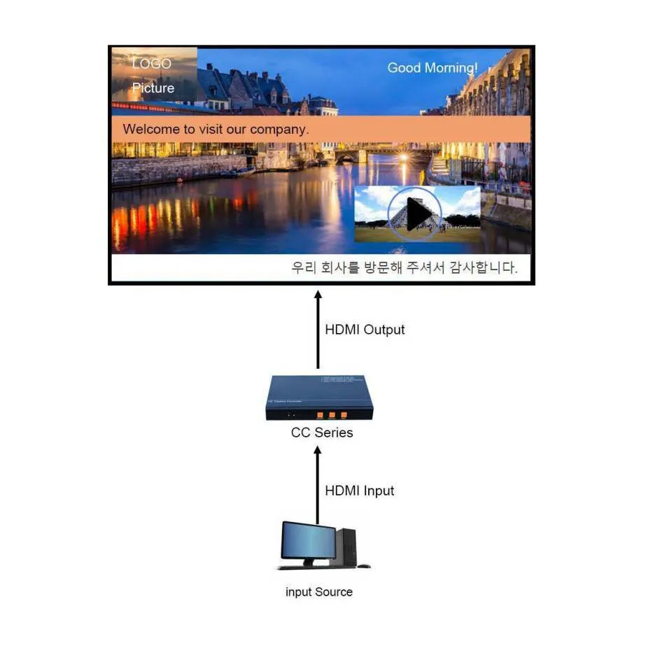 CC Series is a Caption Controller, products using advanced text overlay technology, HD HDMI signal superimposed on text and HD picture and the words flow. Users can superimpose text of any size in any position, and the font color and font background can be arbitrarily selected .