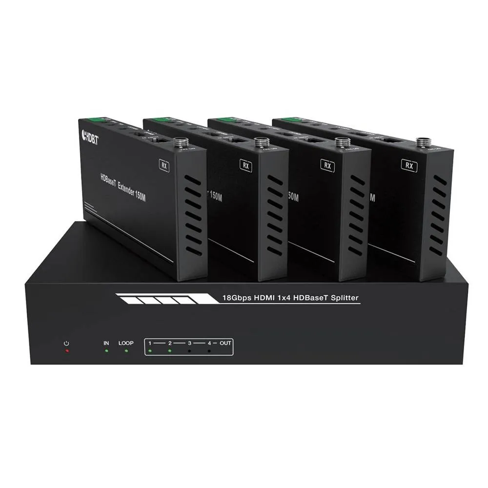 HS-HB-14 18Gbps HDMI 1×4 HDBaseT Splitter can distribute 1 source signal to any 4 display devices. The HDMI signal transmission distance can be extended up to 120 meters at the resolution of 4K2K@60Hz, 150 meters at 1080P@60Hz via a single CAT6/6a/7 cable. The product supports up to 7.1CH HD audio pass-through. Audio extract function and advanced EDID management are supported.