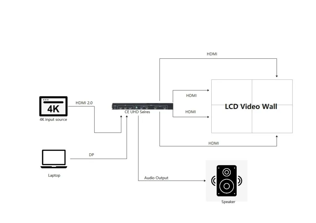 CE-UHD Series is a 4K four-screen video wall processor. Its main function is to display a 3840×2160@60HZ ultra-high-definition image on a 2×2 splicing display unit. The product adopts advanced image processing technology, and the input signal can support HDMI2.0 at most, that is, 3840×2160@60HZ. Even when playing fast animation, there will be no delay or frame loss.