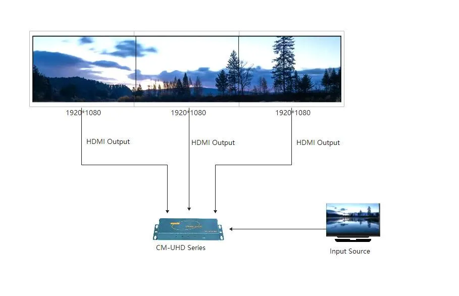 CM-UHD series is a multi-display adapter 1 channel input and 3 channels output that supports 1 x DP signal input and 3 x HDMI signal outputs. Its main function is to make a computer’s DP output expand 3 x HDMI signals, and achieve that each output HDMI interface can run a program full screen.